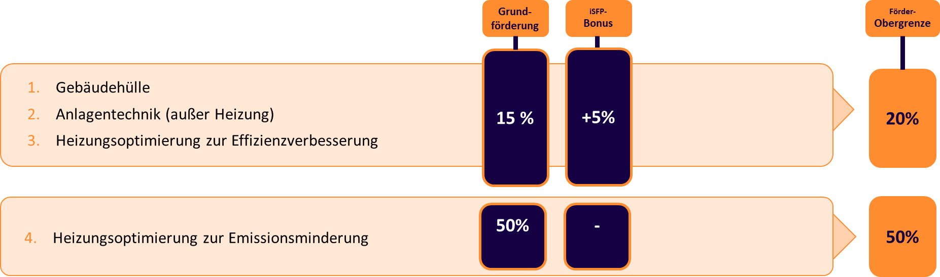 Wenn Ihnen ein individueller Sanierungsfahrplan vorliegt, können Maßnahmen an der Gebäudehülle und der Anlagentechnik sowie für die Heizungsoptimierung zur Effizienzverbesserung, um weitere 5 % der förderfähigen Ausgaben bezuschusst werden.