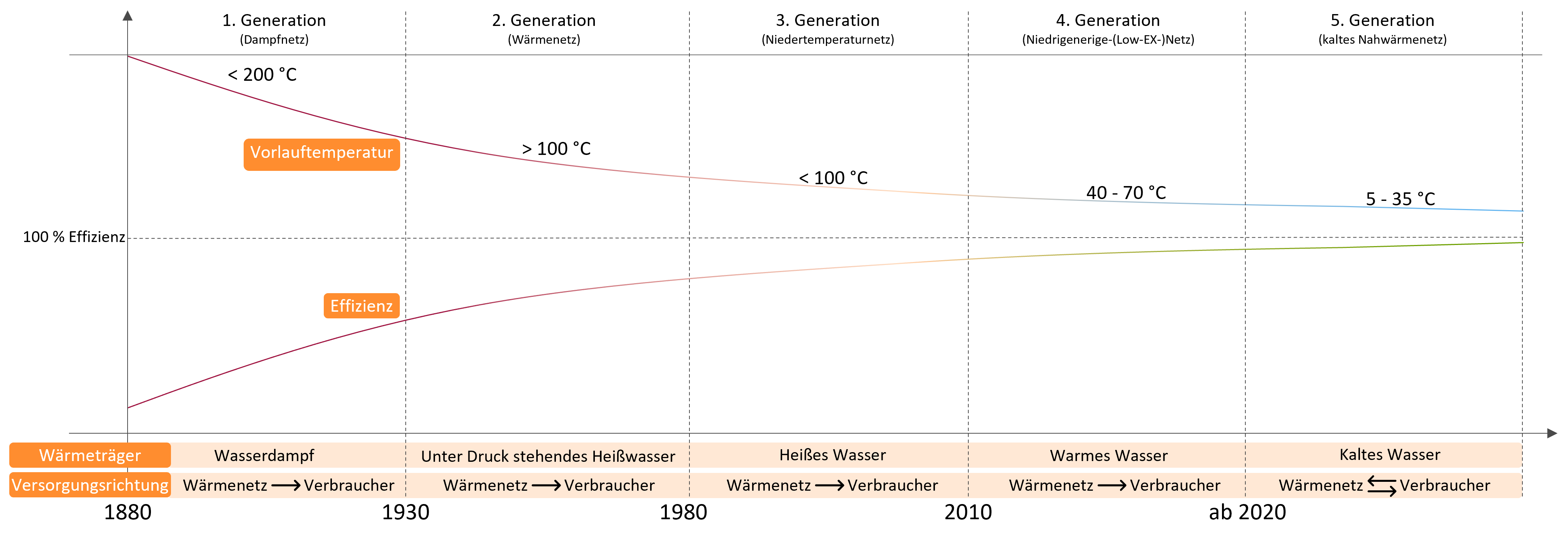 Demgegenüber stehen innovative Wärmenetze mit niedrigeren Temperaturen (4. - 5. Generation) in denen Wärme mit häufig unter 30 °C verteilt wird. Der Vorteil von Netzen mit geringer Transporttemperatur ist, dass auch Solarthermie oder Niedertemperaturabwärme bspw. aus Rechenzentren als Wärmequelle möglich sind. Durch die niedrige Temperatur verringern sich zudem die Wärmeverluste. Somit können die Wärmeleitungen mit geringerer oder keiner Isolierung und dadurch günstiger verlegt werden. Für Flächenheizungen reicht das Temperaturniveau an der Hausübergabestation meist aus. Für andere Heizkörper und/oder zu Warmwasserzwecken muss hingegen im Gebäude das Temperaturniveau angehoben werden. Hierfür kommen zukünftig an der Hausübergabestation meist Wärmepumpen sowie Stromdirektheizungen zum Einsatz.